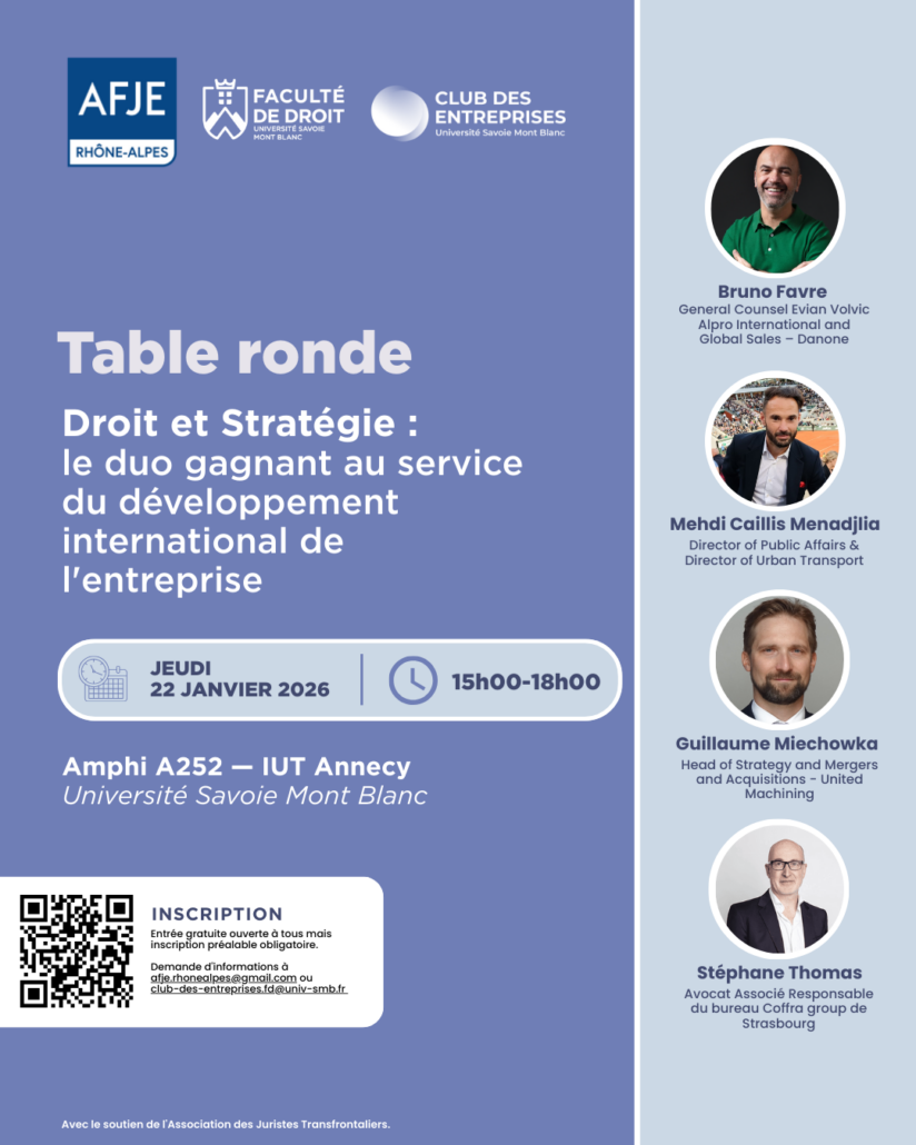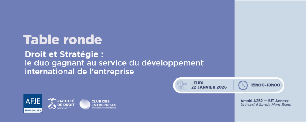 La Faculté de droit de l’Université Savoie Mont Blanc organise en partenariat avec la Délégation AFJE Rhône-Alpes, son Antenne des 2 Savoies et le Club des Entreprises de l’USMB, une table ronde exceptionnelle sur le thème :