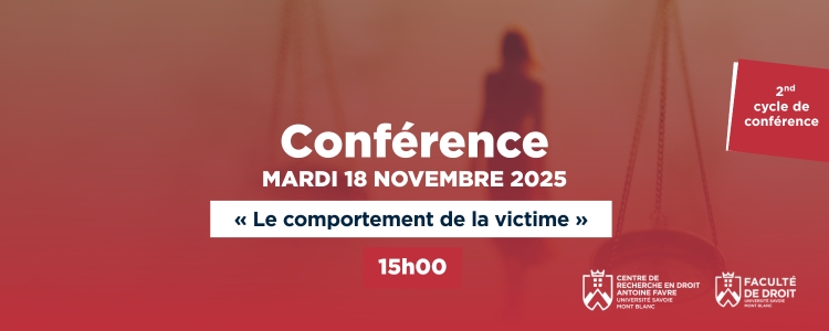 Le Centre de recherche en droit Antoine Favre de l’Université Savoie Mont Blanc organise une conférence consacrée au comportement de la victime, dans le cadre du projet de recherche « Regards croisés sur le Droit de la responsabilité – Divergences, convergences et complémentarité de la responsabilité civile, administrative et internationale dans le droit contemporain ».